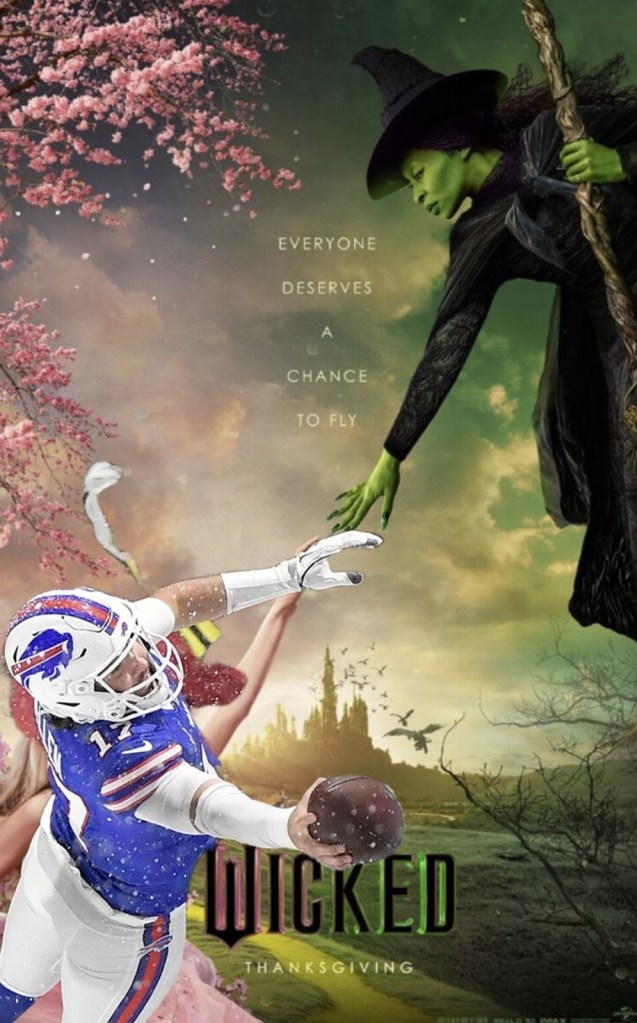 Premio Elphaba “I am defy…ing graaaaaaaaaaaavity” … Para Josh Allen, que lanzó un pase a Amari Cooper que éste le regresó lateralmente para que Allen terminara lanzándose a las diagonales y anotar, desafiando la gravedad y teniendo un pase lanzado y recibido de anotación en la misma jugada. Hasta Patrick Mahomes comentó en twitter que le gustó la jugada (“That was lit”).